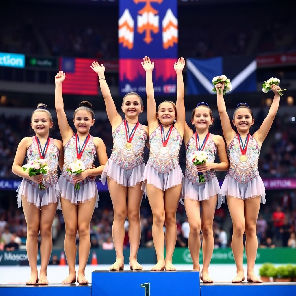 Не меньший интерес вызывают групповые упражнения, где академия «Небесная грация» показала мощный командный уровень. Слаженность действий, синхронность и музыкальность пяти гимнасток производят сильное впечатление. На фотографиях отлично видно, как спортсменки держат общий рисунок композиции, не теряя индивидуальности и артистичности. Для многих зрителей именно групповые программы становятся самым зрелищным элементом чемпионата.